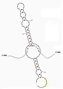 The H/ACA snoRNAs that guide pseudouridylation in Trypanosomes consist of a single-hairpin followed by an AGA-box.[1] These H/ACA snoRNA contain a pseudouridylation pocket that guides the H/ACA snoRNA to the correct region of its target rRNA. The pseudouridylation pocket ensures modification of the correct uridine, as it contains two short sequences that are complementary to the target RNA. In addition it is able to basepair with the regions flanking the uridine in need of modification. Trypanosomal snoRNAs differ in both sequence and structure to eukaryotic snoRNAs as they contain one stem loop and an AGA-box at the 3' end. Despite these differences, trypanosomal snoRNAs function identically to eukaryotic snoRNAs and since the discovery of single stem H/ACA snoRNAs in Trypanosomes, similar single hairpin ncRNAs have been discovered in Archea and Euglena.[2][3][4] The table below summarizes the H/ACA snoRNAs and the corresponding target sites identified in Trypanosomes.[5]