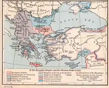 Dušan's systematic offensive began in 1342, and in the end he conquered all Byzantine territories in the western Balkans as far as Kavala, except for the Peloponnesus and Thessaloniki, which he could not besiege due to his small fleet. There has been speculation that Dušan's ultimate goal was no less than to conquer Constantinople and replace the declining Byzantine Empire with a united Orthodox Greco-Serbian Empire under his control.[24][25] In May 1344, his commander Preljub was stopped at Stephaniana by a Turkic force of 3,100.[26] The Turks won the battle, but the victory was not enough to thwart the Serbian conquest of Macedonia.[27][28] Faced with Dušan's aggression, the Byzantines sought allies in the Ottoman Turks, whom they brought into Europe for the first time.[29]