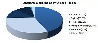 - Hokkienese / Fukienese / Fujianese / Fookienese (Philippine Hokkien simplified Chinese: 福建人 / 闽南人; traditional Chinese: 福建儂 / 閩南儂; Pe̍h-ōe-jī: Hok-kiàn-lâng / Bân-lâm-lâng, Mandarin simplified Chinese: 福建人 / 闽南人; traditional Chinese: 福建人 / 閩南人; pinyin: Fújiànren / Mǐnnánrén)—terms referring to Chinese Filipinos whose predominant ancestry is from Fujian Province in China, especially the Hokkien-speaking region in Southern Fujian. Chinese Filipinos of this background typically have Philippine Hokkien as a heritage language, though just as any Chinese Filipino may also normally speak Philippine English, Filipino/Tagalog or other Philippine languages (such as Visayan languages) and may also code-switch any and all of these languages, such as Taglish, Bislish, Hokaglish, etc.