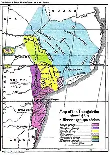 The historical movements of the Tsonga people is dominated by separate migrations, with the Tembe people settling at the Southern parts of Eswatini around the 1350s and the Van'wanati and Vanyayi settling in the eastern Limpopo region between the late 1400s and 1650s.[3] Separate migrations from parts of Mozambique occurred shortly thereafter and particularly during the 1800s. According to historical records acquired from the Portuguese (who are perhaps the first Europeans to ship to African soil in the 1400s) and Swiss Missionaries who arrived to Mozambique and South Africa in the 1800s, Portuguese sailors encountered Tsonga tribes near the coast of Mozambique.[4] Early tribes identified are names such as the Mpfumo who belong to the Rhonga clan within the wider Tsonga (Thonga) ethnicity, and further identified during the 1500–1650 are the Valenga, Vacopi, Vatonga (Nyembana), Vatshwa, and Vandzawu.