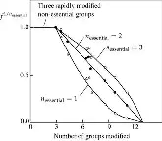 in which is the value of when and is the observed first-order rate constant for inactivation, the sum of the rate constants for the separate reactions. The equation can be extended in an obvious way to the case more than two groups are essential. Ray and Koshland also described the properties to be observed when not all of the modified groups are essential.