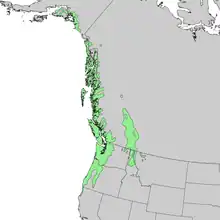 T. heterophylla is an integral component of Pacific Northwest forests west of the Coast Ranges, where it is a climax species. It is also an important timber tree throughout the region, along with many of its large coniferous associates.[8] The species is closely associated with temperate rainforests, and most of its range is less than 100 kilometres (62 miles) from the Pacific Ocean. Valleys it can be found in usually receive at least 80 centimetres (31 inches) of rain annually.[6] It mostly grows at low altitudes, from sea level to 600 m (2,000 ft). In western Washington, it can be found up to elevations of 1,070 m (3,510 ft).[6] The species can also be found in humid areas of mountains further inland, where western white pine is normally dominant.[6] For example, in the Columbia Mountains in and around southeastern British Columbia and northern Idaho, it grows up to 1,500 m (4,900 ft), particularly on north-facing slopes.[6] In the interior part of its range in Idaho, it can be found up to 1,800 m (5,900 ft).[4][5]