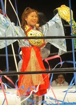 Between October 26 and November 3, Fujimoto took part in a tournament to crown the new Reina World Women's Champion. After defeating Rina Yamashita in the quarterfinals and Yako Fujigasaki in the semifinals, Fujimoto defeated Syuri in the finals to win the tournament and become the new Reina World Women's Champion.[189] She made her first successful defense of the title at an Ice Ribbon show on November 23 against Yuka.[190] She made her second successful defense back in Reina on December 26 against Maki Narumiya.[191] The following day, Best Friends won two more titles, when they defeated the Jumonji Sisters (Dash Chisako and Sendai Sachiko) for the Daily Sports Women's Tag Team and JWP Tag Team Championships.[192] On March 25, 2016, Fujimoto lost the Reina World Women's Championship to Makoto in her second defense.[193][194] On May 4 at Ice Ribbon's 10th anniversary event, Fujimoto wrestled in a special non-title tag team match, which featured the promotion's founder Emi Sakura wrestling her first Ice Ribbon match in over four years.[195] In the match, Fujimoto and Arisa Nakajima defeated Sakura and Nanae Takahashi with Fujimoto pinning Sakura for the win.[196][197] In June, Fujimoto made it to the finals of the 32-wrestler 2016 Catch the Wave tournament, but was defeated there by Ryo Mizunami.[198][199] On July 3, Fujimoto defeated Risa Sera to win the ICE×∞ Championship for the fifth time.[200][201] On August 14, Fujimoto and Nakajima lost the Daily Sports Women's Tag Team and JWP Tag Team Championships to Hanako Nakamori and Kyoko Kimura in their fourth title defense.[202][203] After four successful title defenses, Best Friends lost the International Ribbon Tag Team Championship to Hiragi Kurumi and Tsukushi on September 19.[204][205] After nine successful defenses, Fujimoto was stripped of the ICE×∞ Championship on November 3, after her defense against Tsukushi ended in a 30-minute time limit draw.[206][207][208] Fujimoto eventually made it to the finals of a tournament to crown the new champion, before losing to Risa Sera on December 31.[209] On June 25, 2017, Fujimoto defeated Manami Toyota and Tsukushi to win the Triangle Ribbon Championship for the third time.[210][211] Following the match, Toyota challenged both Fujimoto and Tsukushi to try to defeat her before her retirement from professional wrestling four months later.[210] On November 3, Fujimoto defeated Toyota in her retirement match, scoring the pin with Toyota's own Japanese Ocean Cyclone Suplex.[212][213]
