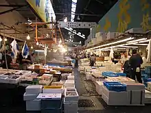 Tsukiji Market (築地市場, Tsukiji shijō) is a major tourist attraction for both domestic and overseas visitors in Tokyo.[1] The area contains retail markets, restaurants, and associated restaurant supply stores. Before 2018, it was the largest wholesale fish and seafood market in the world.[2] The market opened on 11 February 1935 as a replacement for an older market that was destroyed in the 1923 Great Kantō earthquake. It was closed on 6 October 2018, with wholesale operations moving to the new Toyosu Market.[3][4][5][6][7]