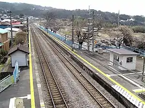 The station has two opposed side platforms connected to the station building by a footbridge. The station is unattended.
