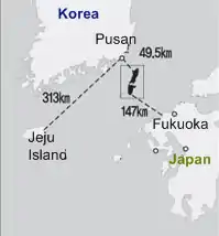 The city of Tsushima is located on Tsushima Island and other small neighbouring islands, lying slightly to the west side of Tsushima Strait, south of the Sea of Japan and north-east of the East China Sea. The island also lies between the Korean Peninsula and the Japanese mainland. Its coastline has a total length of 915 km. Asō Bay, a prominent bay with a rias coastline, is located between the islands. Tsushima lies about 60 km from Iki, 138 km from the city of Fukuoka, and 49.5 km from Busan, South Korea.