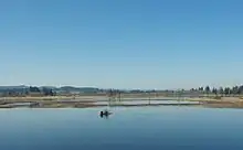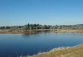 Wapato Lake Unit is located about 15 miles (24 km) to the west of the main refuge, near the city of Gaston along Oregon Route 47 in Washington and Yamhill counties.[16][37] The area was once the site of Wapato Lake, whose soil held an organic-rich peat that sustained a shrub swamp ecosystem. The wapato plant (Sagittaria fasciculata) grew in the upper marsh of the Wapato Lake Basin and was harvested by Native Americans.[33][38] In 1892, attempts began to drain the 800 acres (320 ha) lake to increase farmland,[16][39] with the Wapato Improvement District completing the effort in the 1930s.[40] Valley forests, prairies, and wetlands encompass the region today,[33] including two small streams, Ayers and Wapato creeks.[41]