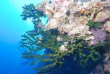 Tubastraea Micranthus, commonly known as the black sun coral, is a coral from the Tubastraea genus, which comprises the sun corals. They have a dark green color and they grow and branch out in bush/tree like colonies.[1] The habitat of T. micranthus ranges from the Red Sea to Madagascar, and into the Pacific as far as Fiji. It has been observed in waters as shallow as 4m to a depth of 138m in the new habitat.[2][3] It is notable though, that in its native habitats Tubastraea micranthus has only been found at depths up to 50 meters and any discovered at lower depths are in invasive environments.[2][4] Furthermore, there have been obscure sightings of Tubastraea Micranthus in Korea.[2]