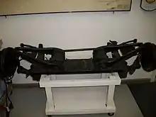 The car had a rear engine and rear-wheel drive. A perimeter frame surrounded the vehicle for crash protection, as well as a roll bar integrated into the roof. The steering box was behind the front axle to protect the driver in a front-end accident. The instrument panel and all controls were within easy reach of the steering wheel, and the dashboard was padded for safety.[16] The windshield was made of shatterproof glass and designed to pop out in a collision to protect occupants. The car's parking brake had a separate key so it could be locked in place to prevent theft. The doors extended into the roof, to ease entry and exit.[15] Each Tucker that was built differed somewhat from the previous car, as each car built was basically a "prototype" where design features and engineering concepts were tried, improved, or discarded throughout the production cycle. The door releases on the interior of the Tucker came from the Lincoln Zephyr. The steering columns used in the Tucker were donated by Ford and are from the 1941 Lincoln. Preston Tucker held a patent for a collapsible steering column design. A glove box was added to the front door panels instead of the more conventional location in the dashboard to provide space for the "crash chamber" that the Tucker is now famous for. This is a padded area ahead of the passenger seat, free from obstructions, providing the front seat passengers an area to protect themselves in the event of an accident.[3] The engine and transmission were mounted on a separate subframe which was secured with only six bolts. The entire drive train could thus be lowered and removed from the car in minutes. Tucker envisioned loaner engines being quickly swapped in for service in just 30 minutes.[17]