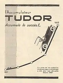 - From 1945, la Société anonyme Accumulateurs Tudor became one of the main starter batteries suppliers for the automotive industry.