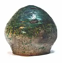 The small ceramic money box was typically spherical in shape. By the 16th century, the form included a tapering, bell-shaped, knobbed top. The container was completely sealed with a narrow coin slot on the side.[1] The glazed, ceramic pots were produced in Surrey and near the Surrey-Hampshire borders.[2] Individual pots were made by white-firing earthenware and then decorating each item with a coloured glaze, known as "Tudor Green". The distinctive colour was created by adding powdered copper to a clear, lead glaze. The glazed pot would range in colour from dark green to yellow-green, depending upon the colour of the clay and thickness of the glaze.[3]