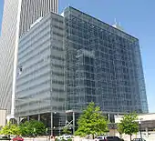 The BOK Tower, built during this period, is the second tallest building in Oklahoma and the surrounding states of Missouri, New Mexico, Arkansas, and Kansas.[45] Tulsa also has the third-, and fourth-tallest buildings in the state, including the Cityplex Tower, which is located in South Tulsa across from Oral Roberts University, far from downtown.[46] One of the area's unique architectural complexes, Oral Roberts University, is built in a Post-Modern Futuristic style, incorporating bright gold structures with sharp, jetting edges and clear geometric shapes. The BOK Center, Tulsa's new arena, incorporates many of the city's most prominent themes, including Native American, art deco, and contemporary architectural styles.[47] Intended to be an architectural icon,[48] the building was designed by César Pelli, the architect of the Petronas Towers in Malaysia.