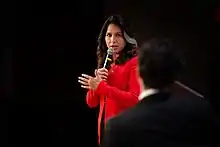 [4] The 2020 presidential campaign of Tulsi Gabbard, the U.S. representative for Hawaii's 2nd congressional district, began on January 11, 2019.[5] In January 2020, she was polling at about 1 to 2 percent.[6][7] Had she won, she would have become the first female, Hindu, and Samoan president in American history, and the youngest person to ever hold the office.[8] She made reducing military activity abroad a central message of her campaign.[9]
