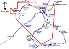 The townsite is located on a series of southern-facing gravel terraces on a ridge of Mount Bergeron, overlooking the confluence of the Murray and Wolverine Rivers.[36] The site, above the floodplain of the Murray River, has well-drained soils with easy access to aquifers with potable water.[37] The rocks, mostly shale and mudstone but lacking quartzite, make the mountains less rugged than their neighbouring ranges.[38] The terraces grow Lodgepole Pine, White Spruce, Trembling Aspen trees. Moose and elk are common.[39][40] Escarpments to the east and north could pose a snow avalanche threat but are kept forested for stability.[41] In 2006, the town was evacuated for several days as four forest fires approached the town.[42]