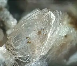 Tumchaite, Na2(Zr,Sn)Si4O11·H2O, is a colorless to white monoclinic phyllosilicate mineral. It is associated with calcite, dolomite, and pyrite in the late dolomite-calcite carbonatites. It can be transparent to translucent; has a vitreous luster; and has perfect cleavage on {100}. Its hardness is 4.5, between fluorite and apatite. Tumchaite is isotypic with penkvilksite. The structure of the mineral is identified by silicate sheets parallel {100}, formed by alternation of clockwise and counterclockwise growing spiral chains of corner-sharing SiO4 tetrahedra. Tumchaite is named for the river Tumcha near Vuoriyarvi massif.[4]