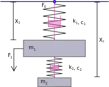 Given a motor with mass m1 attached via motor mounts to the ground, the motor vibrates as it operates and the soft motor mounts act as a parallel spring and damper, k1 and c1. The force on the motor mounts is F0. In order to reduce the maximum force on the motor mounts as the motor operates over a range of speeds, a smaller mass, m2, is connected to m1 by a spring and a damper, k2 and c2. F1 is the effective force on the motor due to its operation.