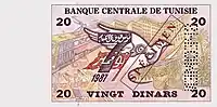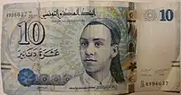 On 3 November 1958, banknotes were introduced by the Central Bank of Tunisia in denominations of 1⁄2, 1 and 5 dinars.[4] The designs of these denominations were changed with a series of notes dated 1-6-1965, but issued on 3 March 1966. A 10-dinar note dated 1-6-1969 was issued on 2 January 1970. The last 1⁄2-dinar notes were dated 1973-10-15 whilst the last 1-dinar notes were dated 1980-10-15. 20-dinar notes dated 1980-10-15 were introduced on 26 December 1984. 30-dinar notes were issued between 1997 and 2011. 50-dinar notes dated 2008 were issued on 25 July 2009.[5] On 8 November 2005, an updated version of the frequently used 10-dinar note was issued.