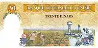 30 dinars | Green, orange | Aboul-Qacem Echebbi | Tunisian farm with goats and ”TRENTE DINARS” written above |