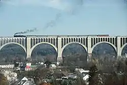 In 1975 the American Society of Civil Engineers or ASCE designated the bridge as a National Historic Civil Engineering Landmark.[17] ASCE noted that at the time of its construction from 1912 to 1915, it was the largest reinforced concrete railroad bridge ever built.[18] ASCE recognized the bridge as "not only a great feat of construction skill" but also a "bold and successful departure from contemporary, conventional concepts of railroad location in that it carried a mainline transversely to the regional drainage pattern, effectively reducing the distance and grade impediments...".[18] At the time the decision was made to build the bridge out of reinforced concrete, railroad engineers had little experience with this material.[18] The bridge was also listed on the National Register of Historic Places on May 3, 1977.[8][9] In 1990, the National Railway Historical Society placed a historical plaque on the structure noting its size as the world's largest concrete bridge, completing the Summit cut-off project for the Delaware, Lackawanna and Western Railroad.