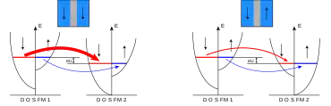 While theory, first formulated in 2001,[4][5] predicts large TMR values associated with a 4eV barrier height in the MTJ's P state and 12eV in the MTJ's AP state, experiments reveal barrier heights as low as 0.4eV.[7] This contradiction is lifted if one takes into account the localized states of oxygen vacancies in the MgO tunnel barrier. Extensive solid-state tunnelling spectroscopy experiments across MgO MTJs revealed in 2014[13] that the electronic retention on the ground and excited states of an oxygen vacancy, which is temperature-dependent, determines the tunnelling barrier height for electrons of a given symmetry, and thus crafts the effective TMR ratio and its temperature dependence. This low barrier height in turn enables the high current densities required for spin-transfer torque, discussed hereafter.