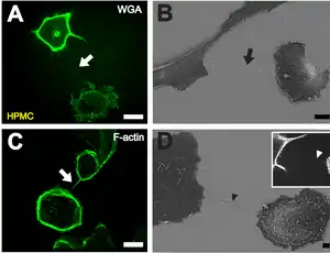 D Scanning electron microscope picture of a substrate-associated filopodia-like extension as potential TNT precursor (black arrowhead). The insert shows a fluorescence microscopic image of substrate associated filopodia-like protrusions approaching a neighboring cell (white arrowhead). Scale bar: 2 μm.[1]