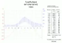 Tura has a very cold subarctic climate (Köppen Dfc) with short, but warm and rainy summers with cool nights and long, bitterly cold winters with little sunshine.