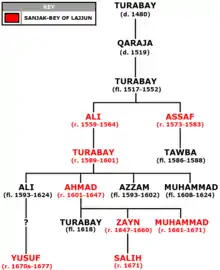 The Iqta of Turabay became its own sanjak, called the Lajjun Sanjak after its center, Lajjun, in 1559.[23] Turabay's son Ali was appointed the new district's sanjak-bey,[22] becoming the first member of the family to hold the office.[24] Under his leadership, the Turabays once again entered into a state of rebellion by acquiring firearms and Ali was replaced by a imperial official, Kemal Bey, in 1564. Three years later the Porte ordered the arrest and imprisonment of a member of the family for stockpiling arms.[22] Ali was succeeded as head of the family by Assaf, who worked to reconcile with the Ottomans by demonstrating his obedience to the Porte. He allied with the sanjak-bey of Gaza, Ridwan Pasha, who lobbied on his behalf to the Porte, writing that Assaf safeguarded the road between Cairo and Damascus. The Porte responded in 1571 that if he continued to be obedient he would be granted the sultan's favor.[25] Two years later he was appointed sanjak-bey of Lajjun.[26][5]