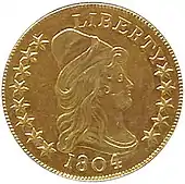 The precious metal composition of US coins was calculated such that gold would be fifteen times as valuable per ounce as silver. By the turn of the 19th century, the price of gold in terms of silver had risen to approximately 15.75 to one. This made it profitable for merchants to buy gold coins at face value using silver coins, and export the gold to Europe. Gold vanished from circulation in the United States by 1800.[21] By 1801, almost no bullion was being deposited at the Mint, causing the Jefferson administration to consider its closure. The eagle was especially desired by exporters, as the larger size and value made it more convenient to handle.[22] Although the Mint remained open, on December 31, 1804, President Thomas Jefferson ordered that eagles and silver dollars no longer be struck, ending the Turban Head eagle series.[23] Coin dealer and author Q. David Bowers suggests that while a majority of eagles remained in the United States, enough were exported to make continuing their mintage an exercise in futility.[24]