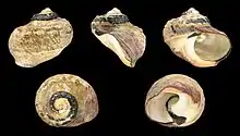The operculum is flat within. It contains 5-6 whorls and a submedian nucleus. The outer surface is convex, whitish, and covered with calcareous pustules on the exterior side.[2]