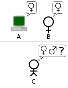 Turing's original article describes a simple party game involving three players. Player A is a man, player B is a woman and player C (who plays the role of the interrogator) is of either gender. In the imitation game, player C is unable to see either player A or player B, and can communicate with them only through written notes. By asking questions of player A and player B, player C tries to determine which of the two is the man and which is the woman. Player A's role is to trick the interrogator into making the wrong decision, while player B attempts to assist the interrogator in making the right one.[7]