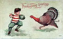 Thanksgiving Day football games in the United States are nearly as old as the game—and the organized holiday—themselves. The first Thanksgiving Day football game took place in Philadelphia, Pennsylvania on Thanksgiving Day of 1869, less than two weeks after Rutgers defeated Princeton in New Brunswick, New Jersey in what is widely recognized as the first intercollegiate football game in the United States, and only six years after Abraham Lincoln declared the first fixed national Thanksgiving holiday in 1863. On November 17, 1869, the Evening Telegraph newspaper of Philadelphia published the following announcement: "Foot Ball: A foot-ball match between twenty-two players of the Young America Cricket Club and the Germantown Cricket Club will take place on Thanksgiving Day at 12 1/2 o'clock, on the grounds of the Germantown Club."[1] The proximity of Philadelphia to both Rutgers and Princeton invites speculation that this game may have been played under similar rules and perhaps involved some of the same participants, or at least people familiar with the game played at Rutgers, and a second match at Princeton, earlier that month.