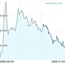 The Turkish Lira regained a significant proportion of its losses within the three months after July 2018. According to the models by IMF and International Institute of Finance made at the time, the lira was getting closer to the fair value but was still slightly undervalued.[91] - 14 June – Turkish President Recep Tayyip Erdoğan in a televised interview said that his government would "conduct an operation against" international credit ratings agency Moody's Investors Service following elections on 24 June.[92][93] The next day, the lira finished its worst week since 2008, tumbling 5.7 per cent relative to the dollar, while also hitting its worst weekend close ever at US$4.73/TRY.[47]