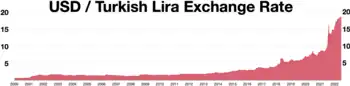 The Turkish economic crisis (Turkish: Türkiye ekonomik krizi) is an ongoing financial and economic crisis in Turkey.[1] It is characterized by the Turkish lira (TRY) plunging in value, high inflation, rising borrowing costs, and correspondingly rising loan defaults. The crisis was caused by the Turkish economy's excessive current account deficit and large amounts of private foreign-currency denominated debt, in combination with President Recep Tayyip Erdoğan's increasing authoritarianism and his unorthodox ideas about interest rate policy.[2][3][4][5] Some analysts also stress the leveraging effects of the geopolitical frictions with the United States. Following the detention of American pastor Andrew Brunson, who was confined of espionage charges after the failed 2016 Turkish coup d'état attempt, the Trump administration exerted pressure towards Turkey by imposing further sanctions. The economic sanctions therefore doubled the tariffs on Turkey, as imported steel rises up to 50% and on aluminum to 20%. As a result, Turkish steel was priced out of the US market, which previously amounted to 13% of Turkey's total steel exports.[6][7]