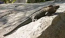The Turks and Caicos rock iguana inhabits small cays, but has been reduced to less than 5% of its original range largely due to the introduction of predators.[5][7]