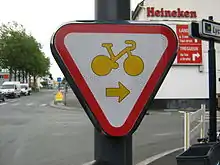 Like in the Netherlands, Belgium and France have a road sign that allows cyclists to turn right on a red light. The French and Belgian signs consist of a yield sign with a yellow bike and arrow inside. Such signs are placed under traffic lights.[57]