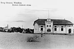 Soon after the foundation of modern Windhoek in October 1890, a posh suburb developed on the slope of the hill opposite the city's railway station. The first Turners club, a German gymnastics association influenced by the suggestions of Turnvater Jahn, was founded in 1899. Exercise and practice took place where the Turnhalle stands today. A temporary corrugated iron structure was erected in 1905.[1]