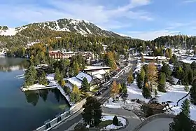 In the wide saddle of the pass summit, where the road runs horizontally for two kilometres, there are two luxury hotels, a resort belonging to the German trade union IG Bau and over 30 small and medium-sized hotels and guest houses. There are many vacation houses in the southern and western stone pine forest, as well as the eastern side of the lake. However, these houses are predominantly concealed by trees or are situated in hollows, so they barely stand out from the natural surroundings.