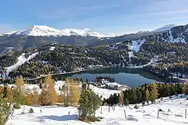 The lake is located within the Gurktal Alps (Nock Mountains) at a height of 1,763 m (5,784 ft) above sea-level. Due to the altitude, it frequently freezes over in winter. In summer, the water temperature can reach a maximum of 18 °C (64 °F); the waters therefore are hardly used for bathing, except for a hotel beach on the southern shore equipped with thermal pumps.