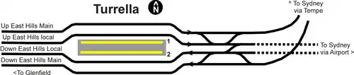 Turrella station opened on 21 September 1931 when the East Hills line opened from Tempe to East Hills.[2][3] In 2000, as part of the quadruplication of the line between Wolli Creek and Kingsgrove, through lines were added on either side of the existing pair.