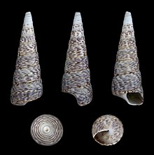 | Five views of a shell of Turritella lentiginosa | |