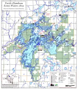 The Turtle-Flambeau Flowage is a 12,942 acres (52.37 km2) lake in Iron County, Wisconsin.[1] It has a maximum depth of 15 meters and is the seventh largest lake in the state of Wisconsin by surface area. The flowage is home to unique wetland patterns and plant species as well as several species of sport and game fish, including Musky, Panfish, Largemouth Bass, Smallmouth Bass, Northern Pike, Walleye and Sturgeon. The lake's water clarity is low, but can vary in different locations in the lake.[2] Fishing, camping, boating, and hunting are popular activities on the flowage, and Ojibwe people traditionally harvest fish and game on the lake. Environmental concerns on the flowage include mercury contamination, algal blooms, and several types of invasive species.