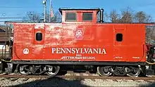 When Dura-Bond purchased Engine 462 in 1982 it also acquired a cupola caboose, which the seller insisted had to be taken along with the locomotive as part of a two-for-one deal.[19] The company originally discussed using this car to serve as a lookout at the end of its trains. But during the 1980s freight operators in the US were phasing out this traditional role of the caboose, and a documentary video of the Turtle Creek Industrial Railroad produced just after this decade showed many of its freight trains in operation, but none with a caboose in tow.[7] By 1999, the caboose was spending most of its days parked near Old William Penn Highway in Export, serving as "a symbol of days gone by".[19] Dura-Bond maintained the caboose in rail-worthy condition for the special occasions on which it would see use, such as transporting Santa Claus during Export's Christmas celebrations. Once service on the line ended, the caboose was thoroughly restored by Dura-Bond and donated to the Export Historical Society, to remain on display on what remains of the TCKR track in downtown Export, Pennsylvania.[25]