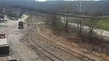 The Turtle Creek Industrial Railroad traces its origins back to 1886, when George Westinghouse chartered what was then called the Turtle Creek Valley Railroad with the hopes of exploiting the natural gas fields in Murrysville. At its westernmost point, the line began in East Pittsburgh where it dovetailed into Andrew Carnegie's Union Railroad and then ran eastward along the right bank of Turtle Creek to a junction near SZ tower.[4] In Trafford, it intersected the main line of the Pennsylvania Railroad before proceeding farther up the Turtle Creek Valley to Murrysville.[5] Service on the line began to Murrysville in 1891 and was extended to Export the following year.[6] A branch along Lyons Run was built in 1892[7] or 1893,[8] which ran 3.86 miles (6.21 km) from Saunders Station to Pleasant Valley.[9] In 1917 the primary line was extended eastward from Export to the mines in Slickville.[10]