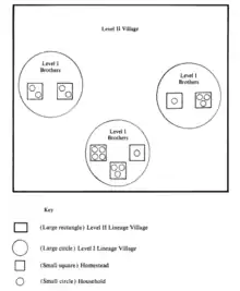 The Turu people define their social organization through lineage or ancestry. The photo to the right visualizes the social composition of the average Turu village. The first level lineage (level 1) is made up of adult brothers, and a second level lineage (level 2) is made up of several level 1 lineages. A Turu village is described as a single level 2 lineage. Several level 2 lineages make a clan (level 3), and several level 3 lineages make up a subtribe (level 4).[3]