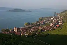 ![]() Twann village with Lake Biel/Bienne and St. Peter's Island in background | |