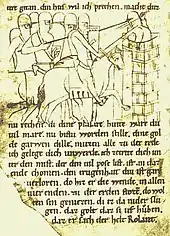 The earliest recorded instance of the word paladin in the English language dates to 1592, in Delia (Sonnet XLVI) by Samuel Daniel.[1] It entered English through the Middle French word paladin, which itself derived from the Latin palatinus, ultimately from the name of Palatine Hill — also translated as 'of the palace' in the Frankish title of Mayor of the Palace.[1] A presumptive Old French form *palaisin was already loaned into late Middle English as palasin in c. 1400.