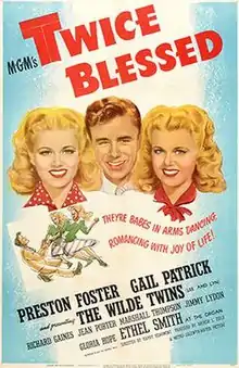 Twice Blessed is a 1945 comedy film directed by Harry Beaumont and starring Preston Foster, Gail Patrick, and Lee and Lyn Wilde. It was an MGM vehicle for the Wilde twins, who were first introduced in Andy Hardy's Blonde Trouble (1944).