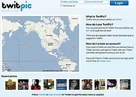 TwitPic was a website and app[2] that allowed users to post pictures to the Twitter microblogging service,[3] which at the time of TwitPic's creation could not be posted to Twitter directly. TwitPic was often used by citizen journalists to upload and distribute pictures in near real-time as an event was taking place.[4][5]