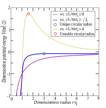 The third term is attractive and dominates at small r values, giving a critical inner radius rinner at which a particle is drawn inexorably inwards to r = 0; this inner radius is a function of the particle's angular momentum per unit mass or, equivalently, the a length-scale defined above.