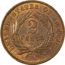 The obverse design is a Longacre version of the Great Seal of the United States.[30] His design focuses on the shield, or escutcheon, as a defensive weapon, signifying strength and self-protection through unity. The upper part of the shield, or "chief", symbolizes Congress, while the 13 vertical stripes, or "paleways", represent the thirteen original states. Consequently, the entire escutcheon symbolizes the strength of the federal government through the unity of the states.[31] The crossed arrows represent nonaggression, but imply readiness against attack. The laurel branches, taken from Greek tradition, symbolize victory.[31] In heraldic engraving, vertical lines represent red, clear areas white and horizontal lines blue, thus the escutcheon is colored red, white and blue and is meant to evoke the American flag.[32] The reverse contains the denomination "2 CENTS" within a somewhat ornate wheat wreath. The rest of the coin is filled with the name of the country.[30]